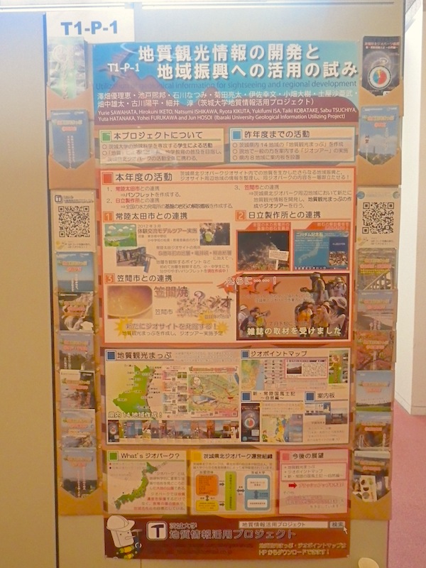 ポスターの両側には,茨城県北ジオパークと地質情報活用プロジェクトのQRコードを用意し,アクセスしていただけるように工夫したり,さらに地質観光まっぷを封筒に入れ,様々な方に手に取っていただけるようにしました!