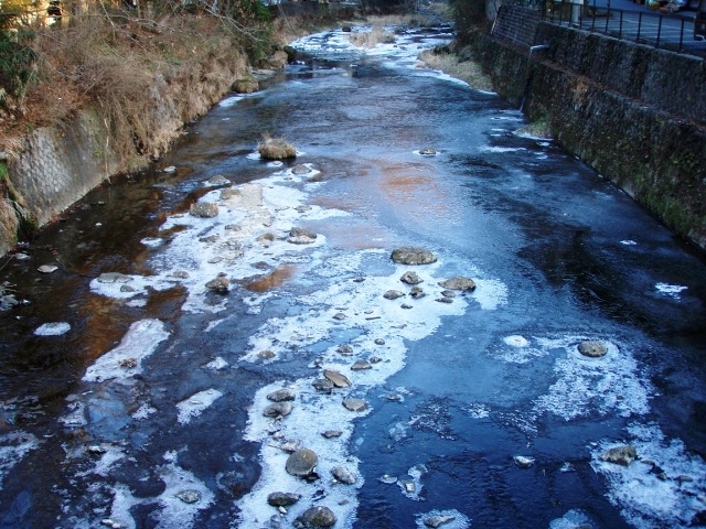 有料駐車場から袋田の滝に向かう途中の川も凍っています。