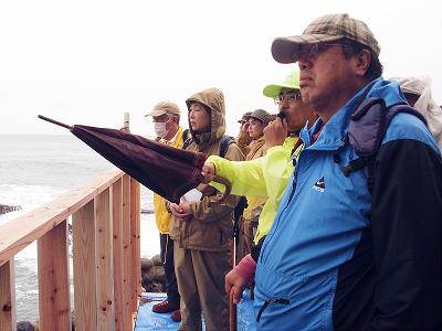 今回はその六角堂があった場所に立つこともでき、建物内にいるような視点から五浦海岸の炭酸塩コンクリーションによる地形の解説を受けました。