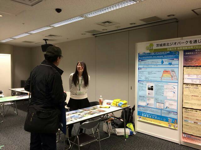 プロジェクトからは,これまでに作ってきた観光マップ「地質観光まっぷ」や学会で発表したポスター,茨城県北ジオパークの鳥瞰図(ちょうかんず;空から鳥の視点で地上を見た地図のようなもの)を展示しました.