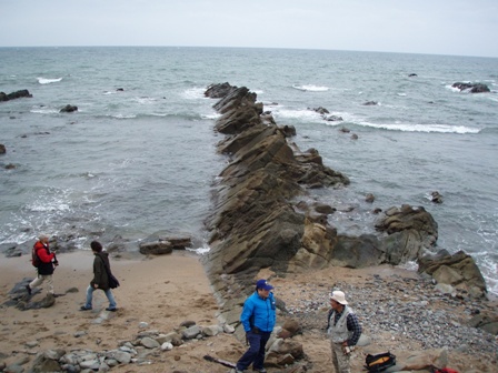 上の写真のように、もともとは水平に堆積したはずの地層が、北(写真左)に傾いています。このような地形が海岸沿いに数百メートルも続いているんです。大地のスケールの大きさを感じることができますね!
