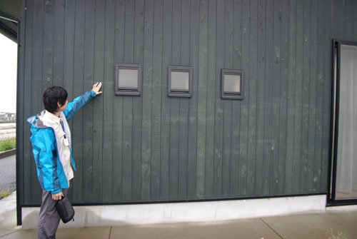 まず,五浦海岸付近にある「よう・そろー」へと向かいました.この頃になると,幸運にも雨が上がり,傘をささなくても良くなりました.この場所は3/11の津波被害を受け,まだ営業の再開ができていません.その為,建物には津波の高さを表す痕跡が残っていました.海面から2mほど高い場所にあるので,写真で見て分かる津波の高さを足し,津波の高さはこの場所で約4mくらいであったと思われます.