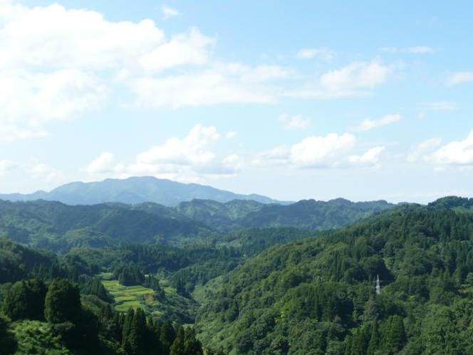 山の中に見えるのは魚沼産コシヒカリの田んぼです!! ちなみに、十日町市は魚沼のなかでも特においしいお米の産地です。