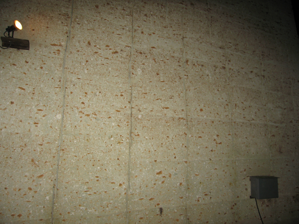 写真を見てください。白い石の中に赤茶色をした斑点があるのが分かるでしょうか?これは、変質した軽石です。大谷石は、地質学的には軽石質凝灰岩といい、実は水中にたまった火砕流堆積物なのです。
