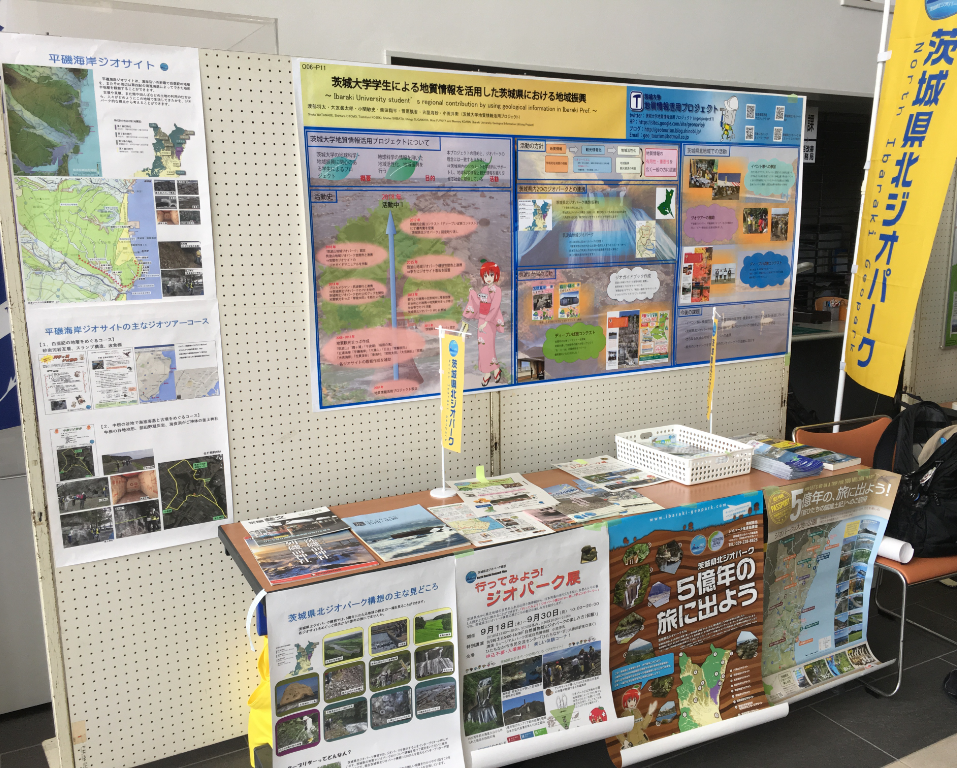 非常に限られたスペースでしたが,その中に県北ジオパークの紹介パンフレットや私たちプロジェクトの活動内容を示したポスターなどを並べ,コンパクトにまとめて展示いたしました.