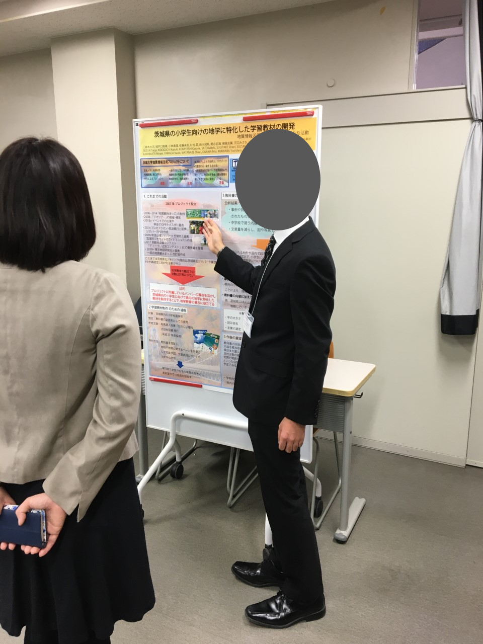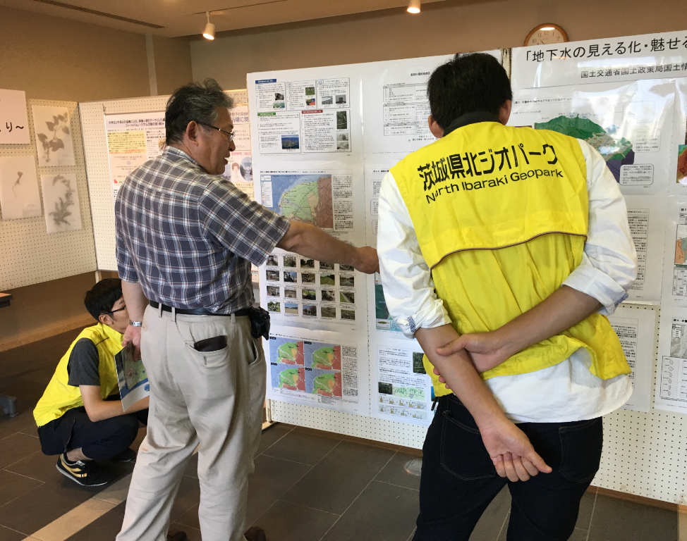展示を見ていただいた参加者の方々に,春に新しく作った水戸・千波湖のジオサイトマップの完成品を手に取っていただいたり,これまでのプロジェクト活動の内容について議論しあうことができました.